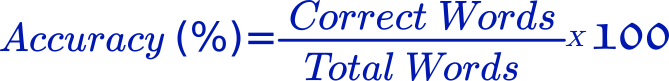 Accuracy is Determined by Dividing the Correct entries by Total Words and the result should be multiplied by 100 for Percentage. Suppose you Made 40 correct entries out of 50 Total Entries of words then result Accuracy would be (40/50)*100=80%.