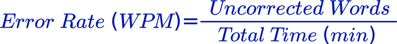 Error Rate is obtained by dividing Incorrect Words by Total Time (in Minutes). Suppose you made Error in 9 Words in 3-minute Typing Test then your Error Rate would be 9/3=3 Words which will be Substituted from Gross Word Per Minute.