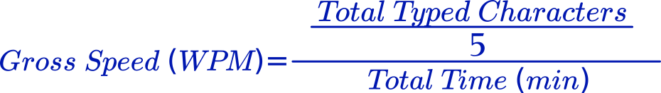 Gross Word Per Minute is reached by first dividing all Typed Characters by 5 then whatever number is derived should be divided by Total Time in Minutes.